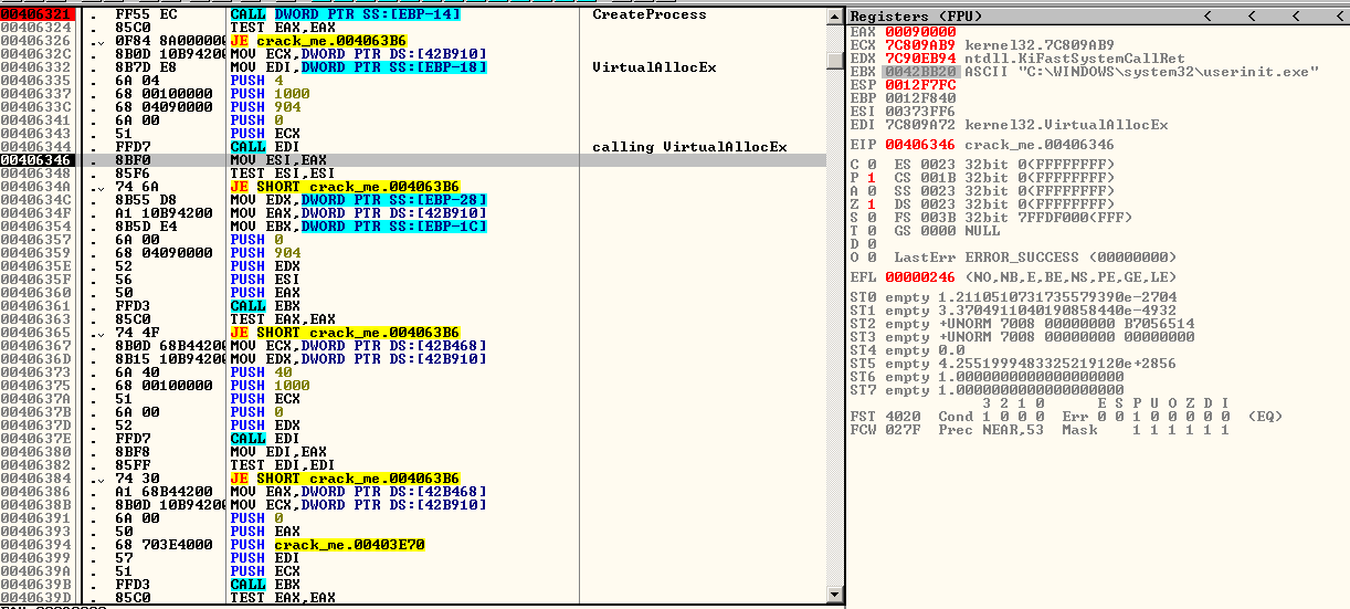 at 0x406348, we see that in EAX, new memory was allocated in userinit.exe’s process space at address 0x90000. This is writing some sort of data, I presume. Then…