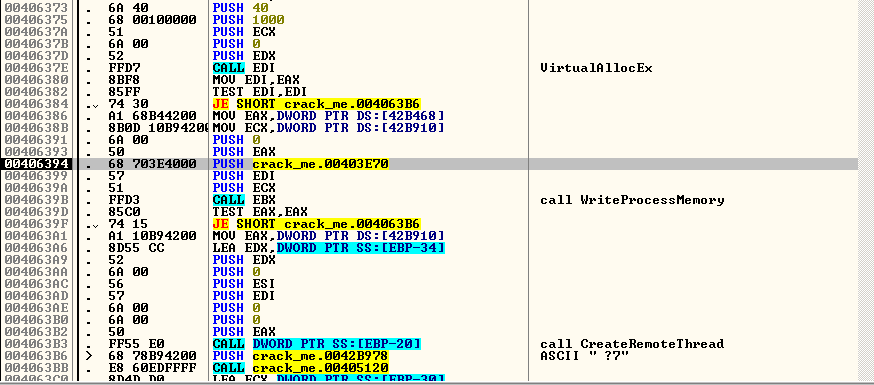 at 0x406380, more memory is allocated in userinit.exe’s process space at location 0xA0000. Continuing a little further…