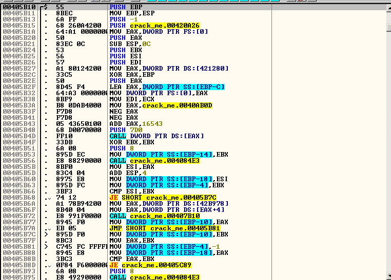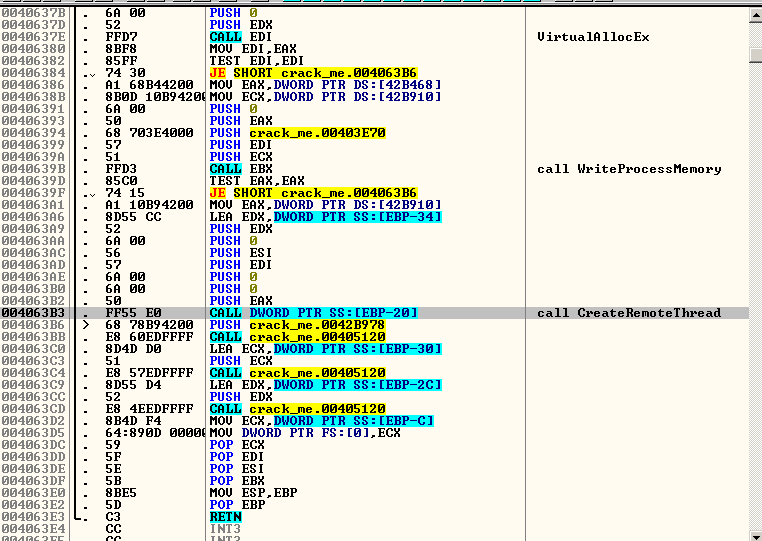 When this tread spawns, the process enters a sleep loop until the CrackMe text boxes are enabled and ready for input. When that happens, the process sends us to a function at 0x405CD0. So I put a break point at that function, let the program run (F9) and waited for a break to step into 0x405CD0. Its a pretty big function but eventually we get to another CreateThread call:
