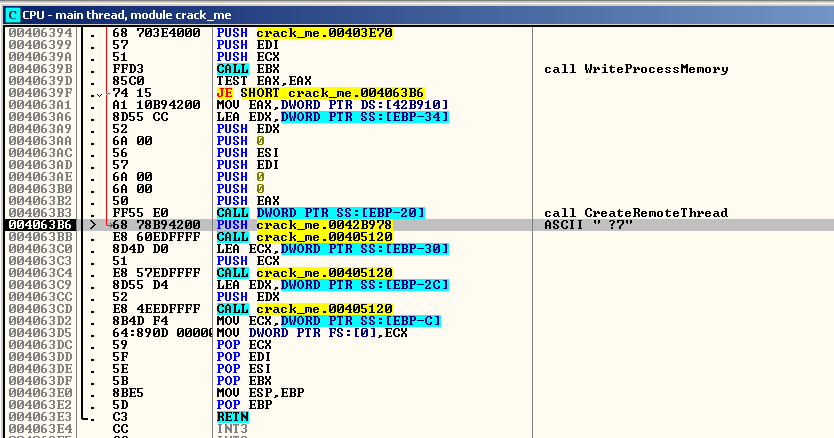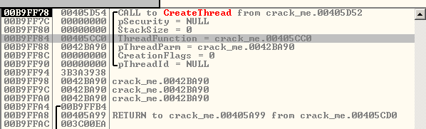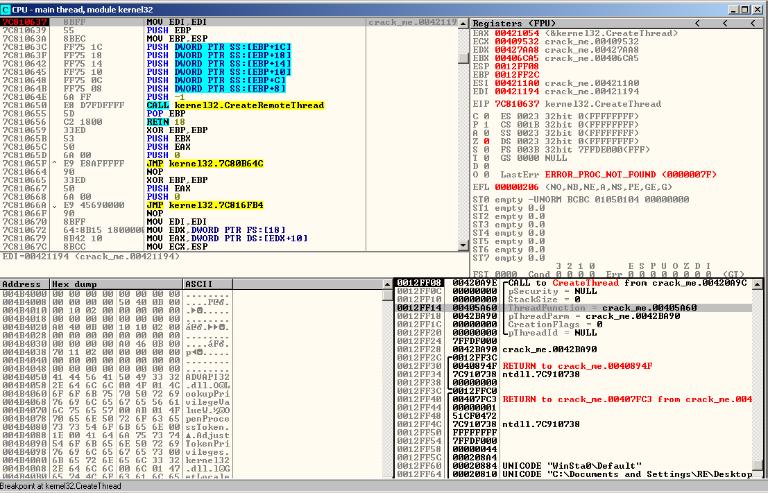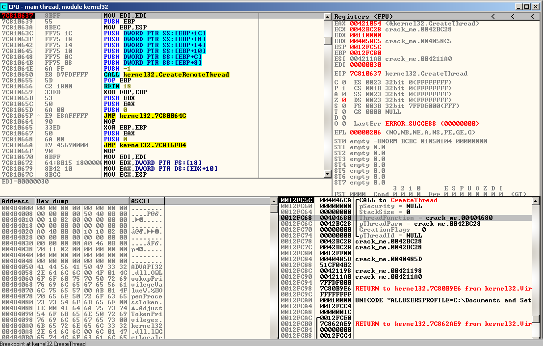 After some thinking, I realized that the CrackMe text box above didn’t appear until the start (WinMain) function ran. But, as we have seen in my previous posts, there is a lot of activity that happens before the start function runs. There were several threads that ran before the main function. I decided to put a break point on CreateThread and examine the corresponding call stack. After setting the break point and hitting F9 to run, we encountered our first break: