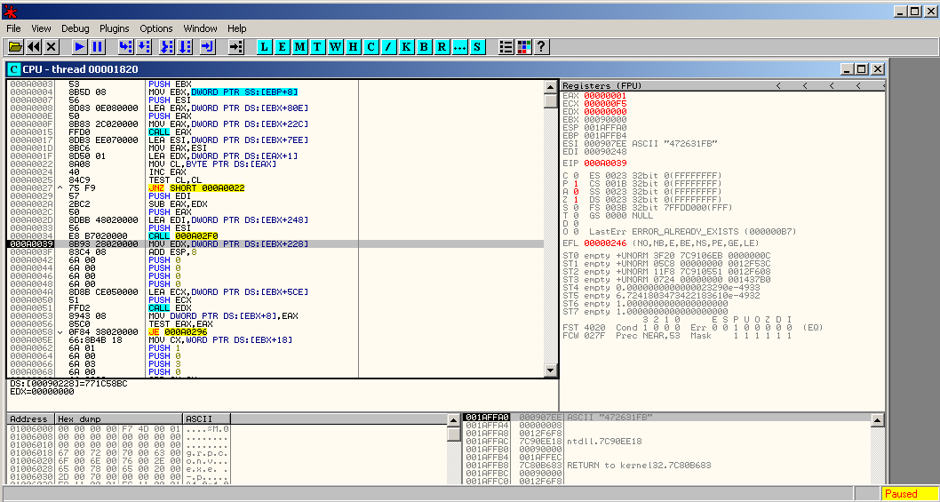 However, I still can not locate the userinit thread in OllyDbg to attach to it. The problem seems to be that when the thread is spawned, it immediately goes into a suspended state, which would explain why I can’t find it in Olly’s active process window. Hmmmmmm…. I will keep trying…