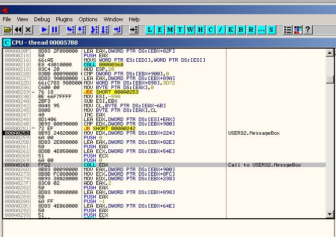 In the example above, the CALL ESI is really a call to user32.7E41D60F, which is between the two addresses highlighted in the screen shot above. So this call must be a call to a SetWindowLong function. I did the same for the FindWindowsEx call that came before the SetWindowLong call. After painstakingly stepping through this function and re-labeling all the user32.dll functions, I finally stumbled upon a key piece as illustrated in the following snippet of code: