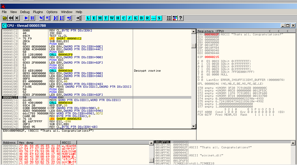 hence, the program will sit here waiting for the correct input from the Stage 2 textbox. If we let the program resume (F9), we should be able to enter some other text into Stage 2. It is likely that the encryption routine is symmetric since that is computationally cheaper than an asymmetric scheme. To test my theory, I entered the word “cat” and hit the check button. When we broke again, I stepped over the encryption routine and observed the encrypted result of “cat”. I copied this encrypted “cat”, then resumed the program again (F9) and pasted the encrypted version of cat into the Stage 2 textbox and hit the check button to return to our current break point. When I stepped over the encrypted routine again, I got back the word “cat”; this confirms my hunch. So, we should be able to apply the same trick to the data at 0x4227EC. Copy and paste that encrypted data into the Stage 2 textbox and let the program run again:
