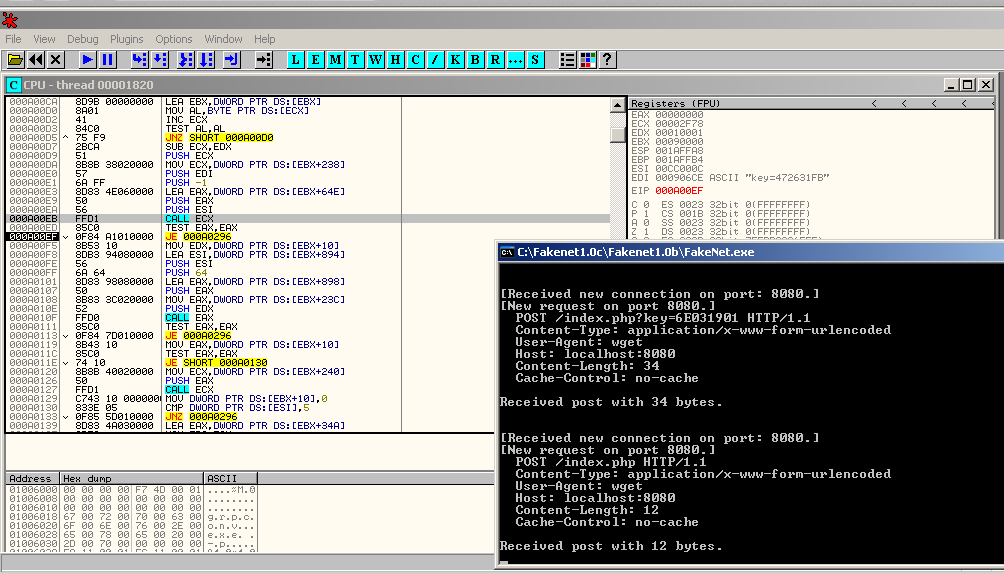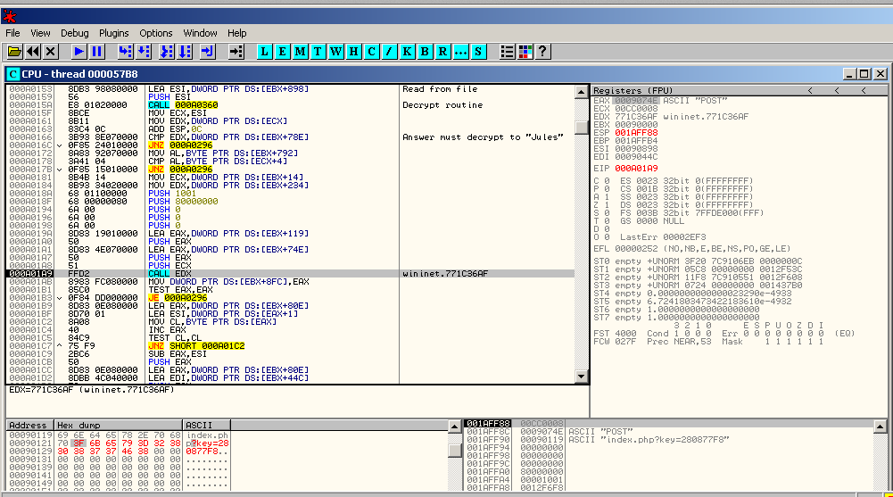 it looks like there is a key of some kind. My guess is index.php must somehow use the code injected into userinit.exe at 0xA0000 to decrypt the data at 0x90000 (???) but I won’t know this for sure until I figure out how to find and attach to the process spawned at 0xA0000.