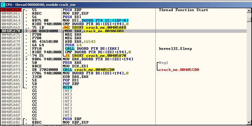 Lets return to the thread function from our CreateThread break at 0x405A60.