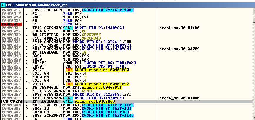 We see that at 0x406023, ECX contains my bogus input and then a call is made to 0x4041D0. What does that do? If we go to 0x4041D0: