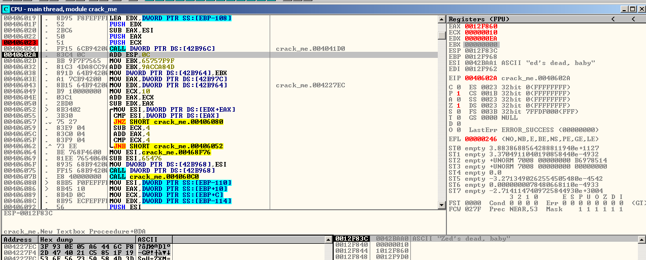 Actually, through trial and error, I discovered that if we place a BP at 0x405F50, the CrackMe text boxes don’t finish rendering yet, and when you click on the CrackMe box, it breaks the program at 0x405F50. I discovered that if we place a BP further down, say at 0x406023, the text box is fully rendered, and we can input text in the Stage 2 box, which will cause us to break at 0x406023. If we do that, and place in any text other than the “I did it!”, we can trace this part of the code to try and figure out what the real message should be: